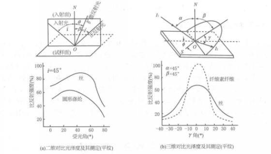 圖片(b)表示三維對比光澤度的測定。入射光以45°照射到樣品表面(即α=45°),樣品表面產(chǎn)生正反射光(β=45°),在正反射光的兩側(cè)(頁面的前后,即γ角)也產(chǎn)生擴(kuò)散反射光,其光強(qiáng)與正反射光強(qiáng)度之比為反射強(qiáng)度(%),隨γ角的變化而變化。纖維纖維織物的峰值高于絲織物。