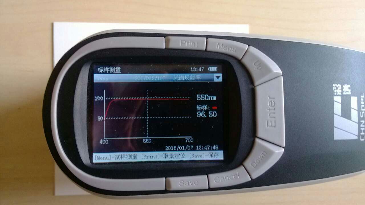 通過up 和down鍵可以移動(dòng)光標(biāo),顯示各個(gè)波長(zhǎng)下的反射率,如圖中顯示550nm,反射率為96.50