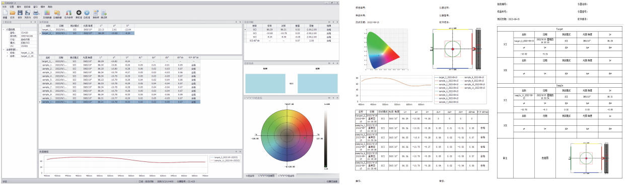 在“顏色檢測(cè)”功能模塊,用戶可通過(guò)電腦軟件校準(zhǔn)、測(cè)量、設(shè)置分光測(cè)色儀。 用戶可將云端數(shù)據(jù)庫(kù)中的顏色作為標(biāo)樣測(cè)色差,查看光譜圖、色差圖、標(biāo)樣試樣數(shù)據(jù),以及導(dǎo)出想要的數(shù)據(jù)測(cè)試報(bào)告。
