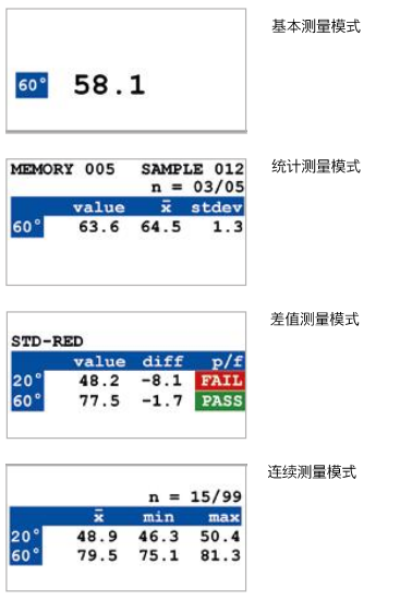 連續(xù)測量模式是快速檢查大面積樣品的均質(zhì)性最有效的方 法。您確定好測量間隔后將微型光澤儀在樣品上持續(xù)滑行, 即刻得到連續(xù)測量結(jié)果。測量結(jié)束后,屏幕顯示平均值、最 大/最小值的范圍。