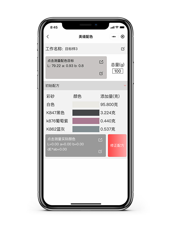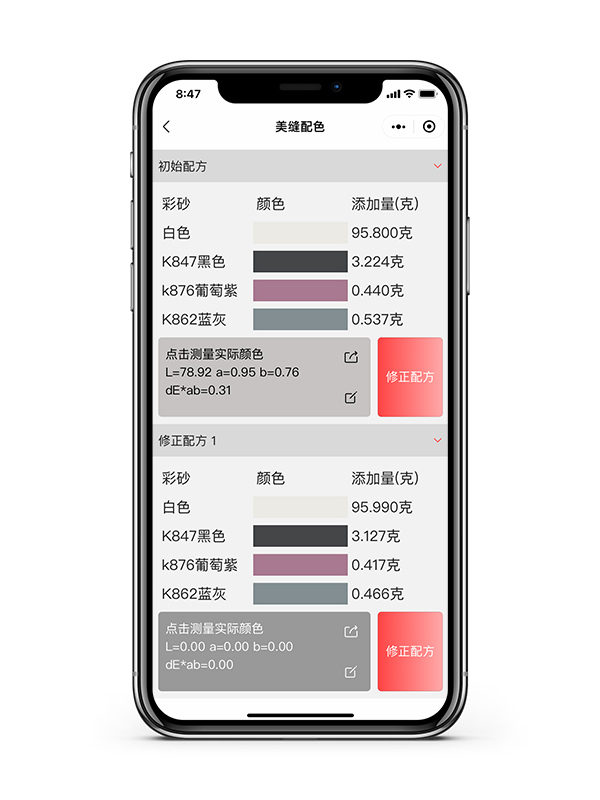 ● 對顏色不合格配方再次修正,使配色更加精準。
