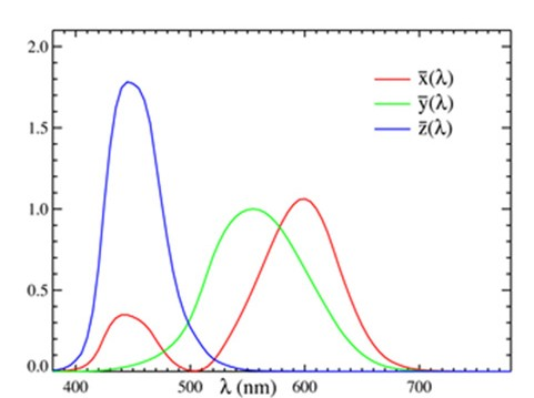 是CIE1931標(biāo)準(zhǔn)色度觀察者的光譜三刺激值,即圖2中的曲線值。k是歸一化系數(shù),物理意義是將光源的Y值歸一化為100,其計(jì)算公式為: