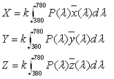 ,其中稱X、Y、Z為該顏色的三刺激值。根據(jù)CIE的規(guī)定,三刺激值可由下面的公式計(jì)算得到。