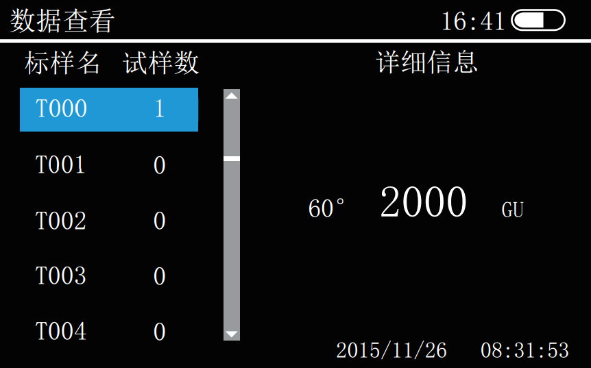 在主菜單界面通過“Up”和“Down”選擇“查看”圖標(biāo),按“Enter”鍵確定,進(jìn)入“數(shù)據(jù)查看”頁(yè)面如下圖所示。在該界面下,用戶可以查看已保存標(biāo)樣、試樣信息。